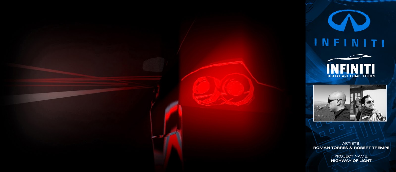This is a digital animation conceived by Bob Trempe and Roman Torres of the USA to reflect the powerful and distinct “character lines” used in the design of every Infiniti model. The digital animation communicates the lines of Infiniti brand by combining a silhouette of a car and the moving light streaks of fast moving vehicles on a highway.